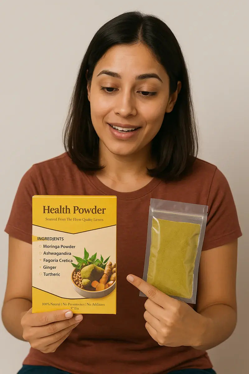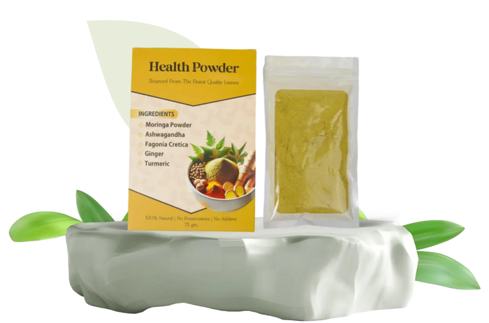 Support your daily wellness naturally with our Health Powder – a powerful blend of Moringa, Ashwagandha, Fagonia Cretica, Ginger, and Turmeric. Made from high-quality plant-based ingredients with no preservatives or additives. 100% natural and crafted to complement a balanced lifestyle.